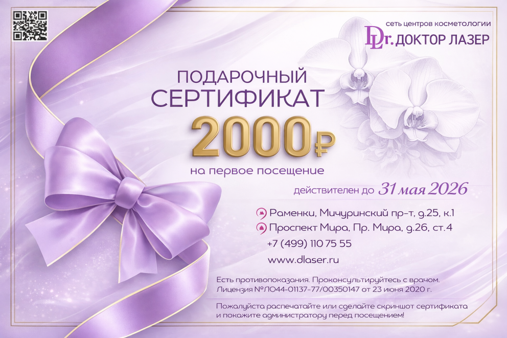 Подарочный сертификат является собственностью ООО МЦ «Доктор Лазер», и условия его использования определяет только компания; условия акции могут быть изменены в любое время.
